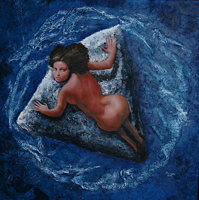 Cada día que la dejaba sola en el estudio llegaba a casa mojado pero no me importaba porque la lluvia interna regaba mi sentimiento y encendía mi pasión. Día tras día aquel cuerpo fue creciendo en su color y las olas amainaron hasta que aquella creación entró en su roca embellecida. Su mirada quedó tan distante que estuve a punto de dejarla en una sala de sirenas pero pensé que mejor que en casa no se está en ningún sitio así que la fui deslizando y la colgué con cariño en la pared de la escalera y desde entonces siempre que subo a mi habitación ella me anima para llegar al piso de arriba pero cuando bajo entonces me mira y sonríe.